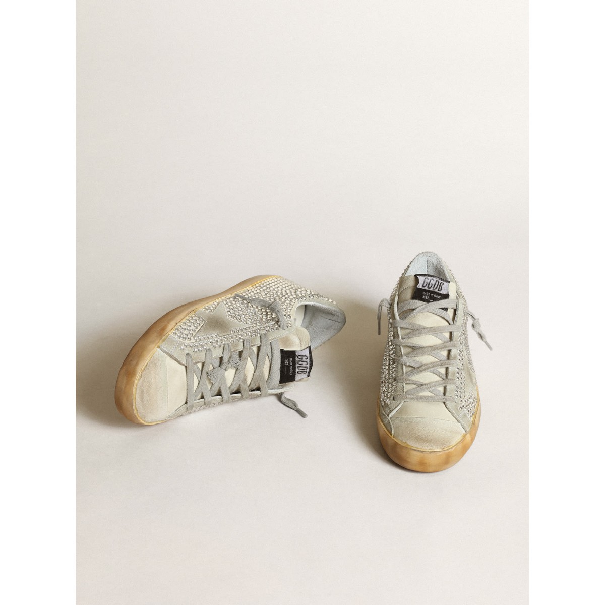 A timeless icon yet one that’s constantly evolving. At Golden, we love taking our classics and reworking them all the time, always from a new angle. These Super-Star sneakers with an off-white nubuck upper with all-over silver Swarovski crystals feature an ice-gray suede star and an off-white nubuck tongue. And ice-gray laces add the finishing touch.